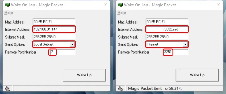 如果需要从外网唤醒,那么我们仍然需要先在路由器中进行端口转发,将192.168.31.147:7转发到外网上去,然后在防火墙中将端口放行。操作方法前面我们已经讲过很多次了,这里就不再重复。设置完成后,在internet address中,填入ddns域名,然后将端口号填写为转发后的外网端口号即可。