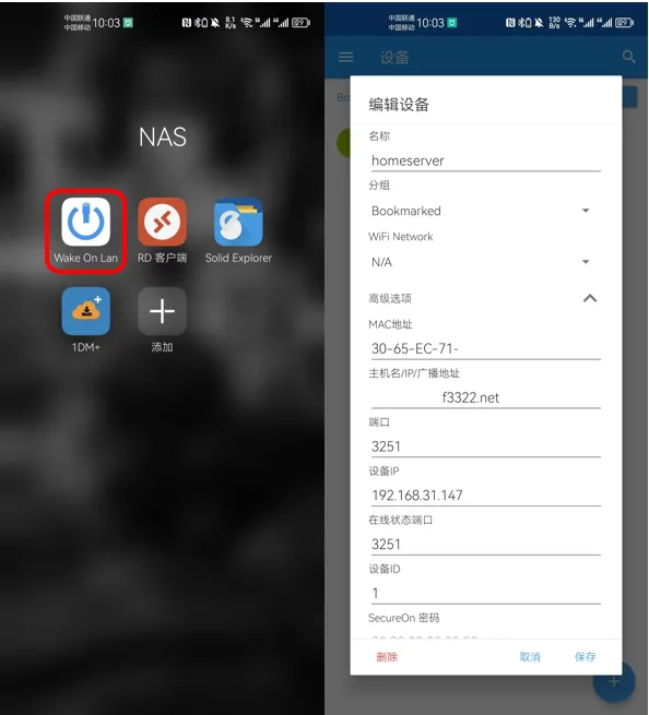 在手机端,我目前使用的wol唤醒app是“wake on lan”。整体设置和pc版的基本一致,进入app后点击右下角的+号,然后一项一项填写即可,非常简单。
