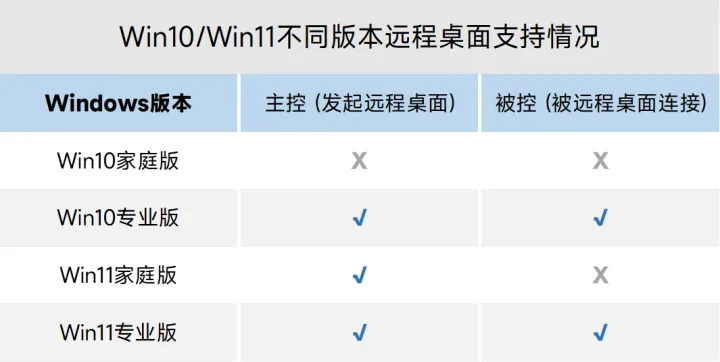 通过表格可以看出,首先win10专业版和win11专业版,都支持远程桌面全功能,而win11家庭版只可以发起控制,不能作为被控端。最后win10家庭版则完全不支持远程桌面。