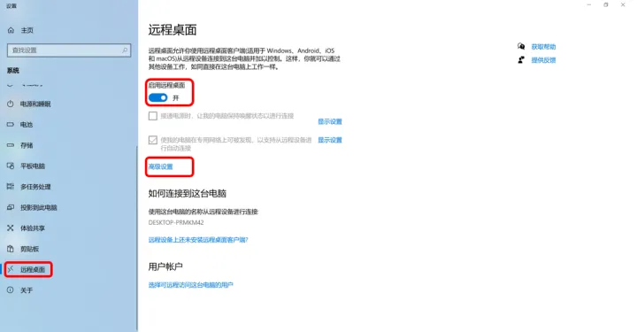 设置→系统(鼠标滚轮滚到最下方)→远程桌面,将右侧“启用远程桌面”开关打开