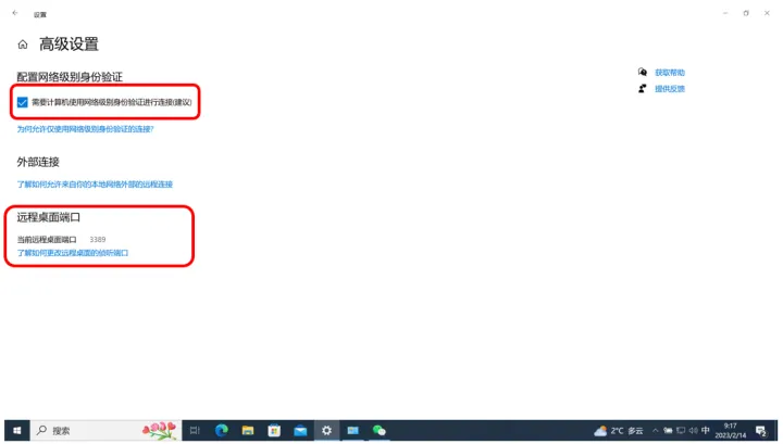 在开关下方的“高级设置”中,我们点开后,确保勾选“需要计算机使用网络级别身份验证进行连接(建议)”。另外,远程桌面的默认内网端口号为3389,记住这个端口号就可以,一般我们不需要去改动他。如果实在想改的话,需要在注册表中进行修改,具体方法可以点开下面的“了解如何更改远程桌面侦听端口”。