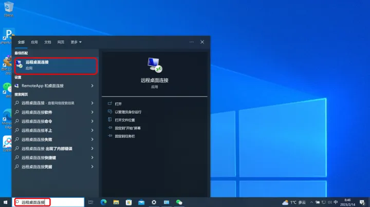 这样,在nas主机(被控端)上,我们的远程桌面就已经开启了。现在我们转到另一台发起主控的电脑上,在桌面搜索框中输入“远程桌面连接”并点击进入: