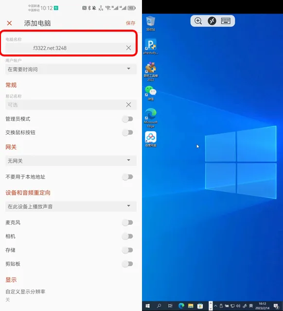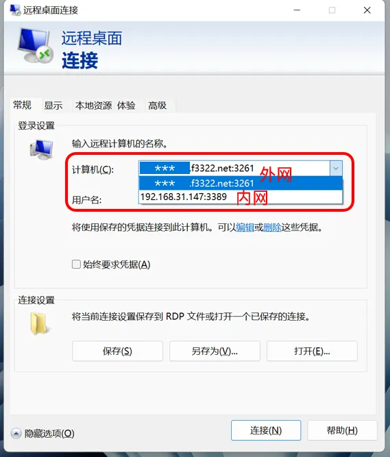 如果想从外网访问的话,还是老规矩,需要先到路由器中做一个端口转发,将内网3389端口转发到公网并在防火墙中放行,然后在“计算机”中输入ddns域名+外网端口号即可。