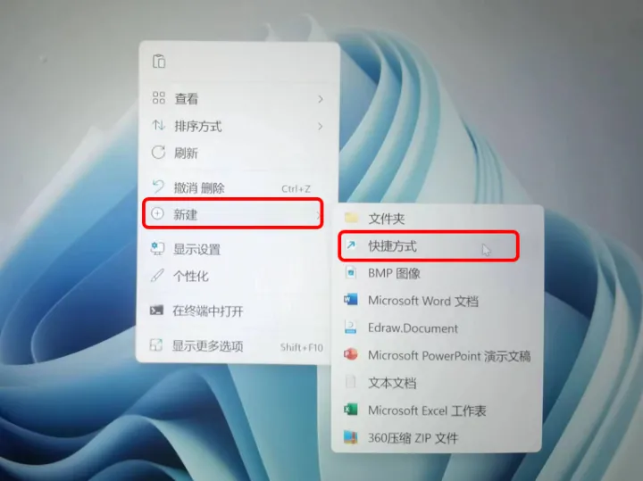 桌面任意空白处单击鼠标右键→新建→快捷方式