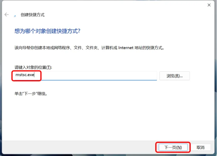 在“请键入对象的位置”中,输入“mstsc.ext”并点击下一步。