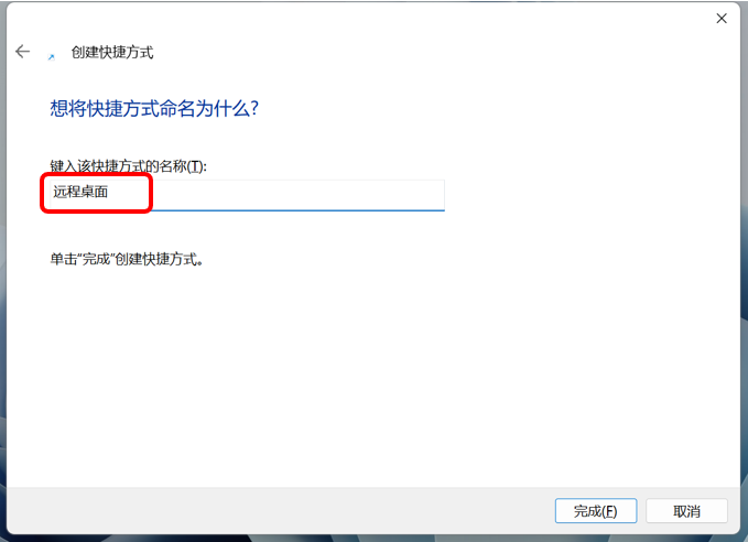 接下来将其命名为“远程桌面”,以后我们就可以直接通过桌面上的快捷方式进入了!