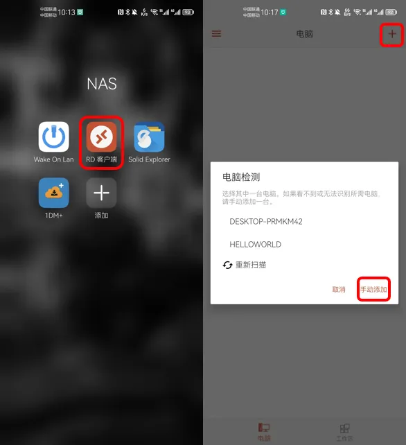 除了pc端以外,在安卓和ios端,windows远程桌面也有免费的官方版本提供。以安卓为例,到应用市场中下载rd客户端,进入app后,点击右上角的+号,然后点击“手动添加”。