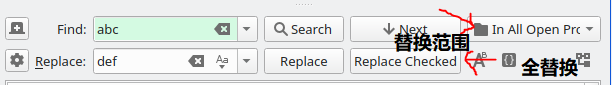 "replace checked"按钮,可以用来 替换 如在所有的打开文件中,按照关键字能够搜索到的全部内容。