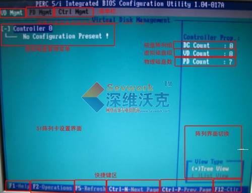 这张阵列卡是企业级高级阵列卡,功能强大,还能导入外部阵列信息---就是说,如果用其他阵列卡组的阵列,移过来,他可能还可以导入使用,保障数据不丢失。 但这些功能,对不会使用的人会造成一些困惑,因为经常会出现进组阵列会找不到硬盘,或硬盘状态不正常,而在阵列的第一个界面,pd count中显示的磁盘数又是正常的对于这种情况,用以下可以解决 在controller菜单上面按f2键,会有三个选项,如下图