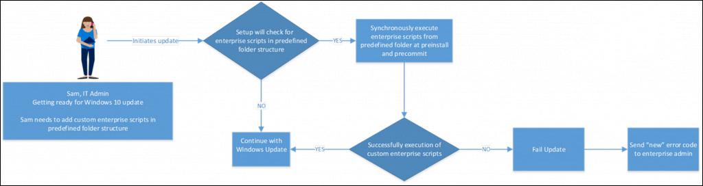 企业用户可以在功能更新期间支持自定义操作:在该版本中,企业可以在安装程序(setup)时同步运行自己的自定义操作/脚本。安装程序将在使用preinstall.cmd或precommit.cmd两个更新阶段执行自定义操作: