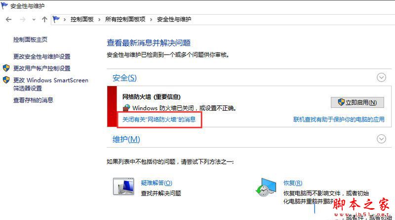 打开安全性与维护界面后,安全菜单里会有网络防火墙的信息,点击关闭有关“网络防火墙”的消息;关闭后就不会再有通知了。
