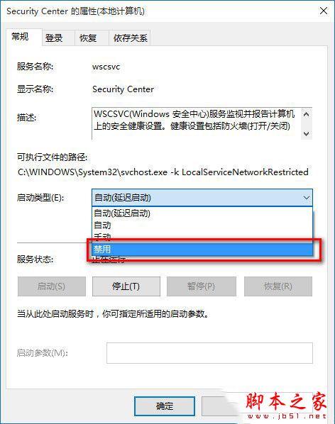 3、双击打开securitycenter属性,停止该服务并设置启动类型为“禁用”。