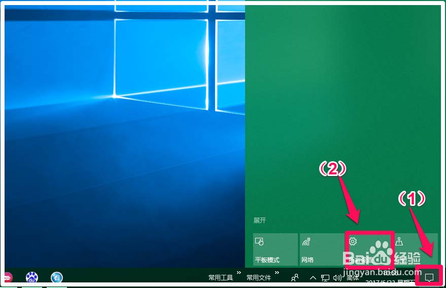 1、点击系统桌面右下角的操作中心通知图标(1),再点击:所有设置(2);