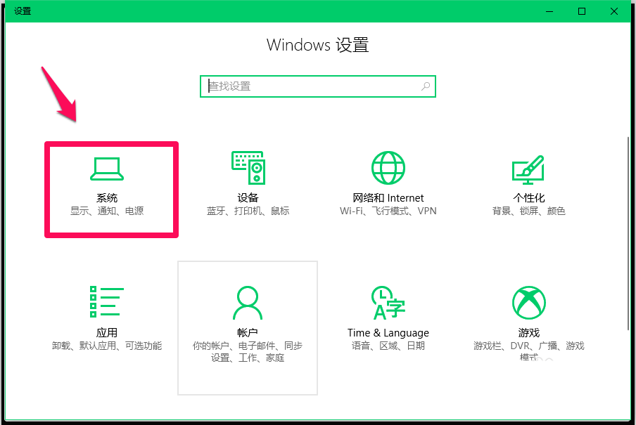 2、在打开的windows 设置窗口中,我们点击:【系统】显示、通知、电源;