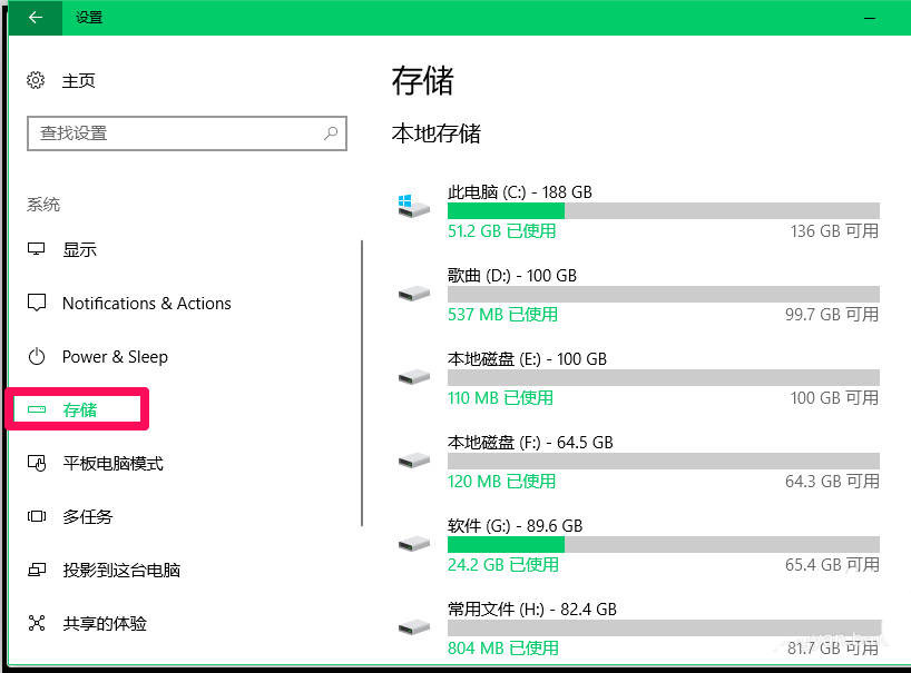 3、在系统设置窗口,我们点击窗口左侧的【存储】;