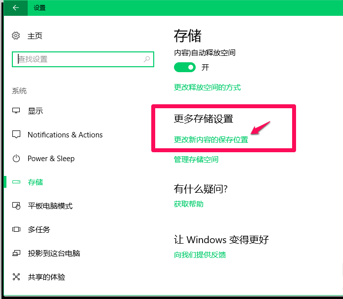 windows10系统的【存储】原来在【网络和internet】-【数据使用量】-【相关设置- 存储设置】中,但windows10-16226版系统,找到【存储】的路径为:【系统】-【存储】,如果需要更改新内容的保存位置,在【存储】对应右侧窗口中下拉到【更多存储设置 -更改新内容的保存位置】。