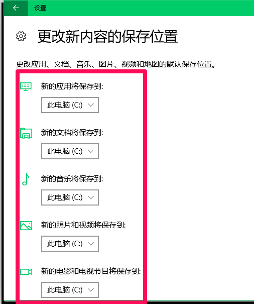 即所有文件都将保存到此电脑(c:\)。(系统c盘空间不越来越小才怪)