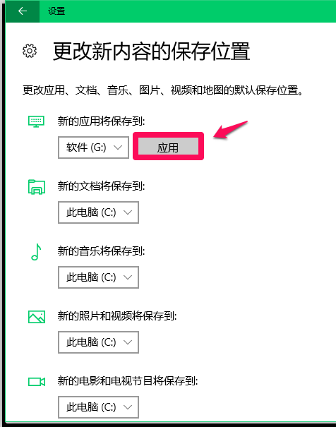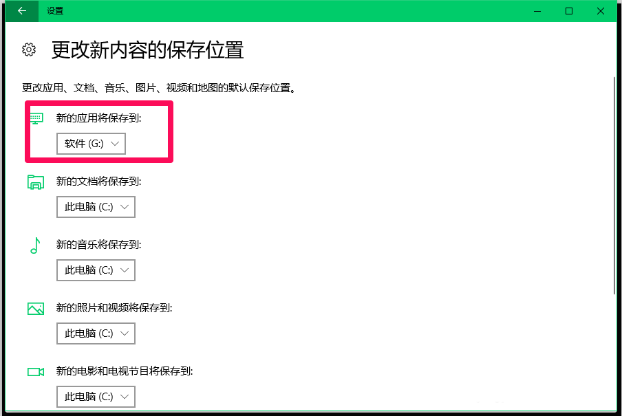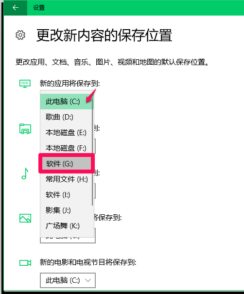 如:更改新的应用保存到(g:\),点击:新的应用将保存到:此电脑(c:\),在下拉菜单中点击:软件(g:\);