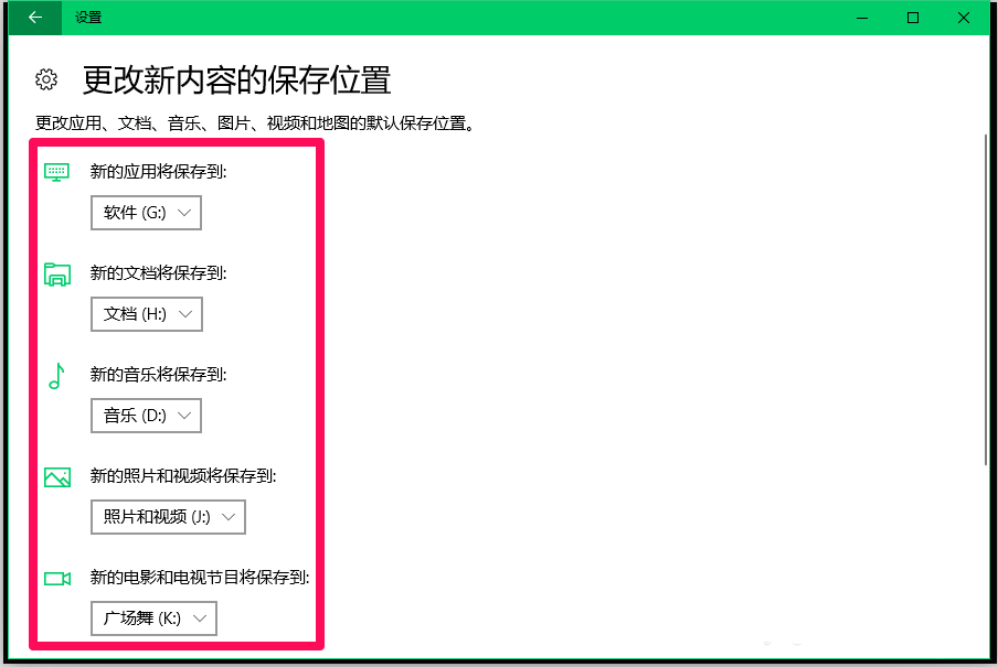 5、在更改新内容的保存位置设置窗口中,我们可以看到: