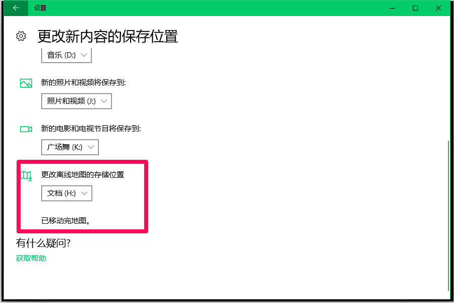 10、更改离线地图的存储位置:此电脑(h:\),显示:已移动完地图。