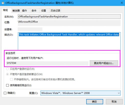 3. 然后右击 “officebackgroundtaskhandlerregistration”>【属性】>在弹出的对话框中点击 【更改用户或组】, 输入 “system” 后,全部确定即可。