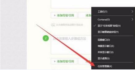 1、用鼠标右键任务栏,使出现如图菜单选项,选择“任务管理器”