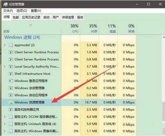 3、向下拖动找到“windows资源管理器”项目,选中“windows资源管理器”,点击窗口右下方“重新启动”选项即可。