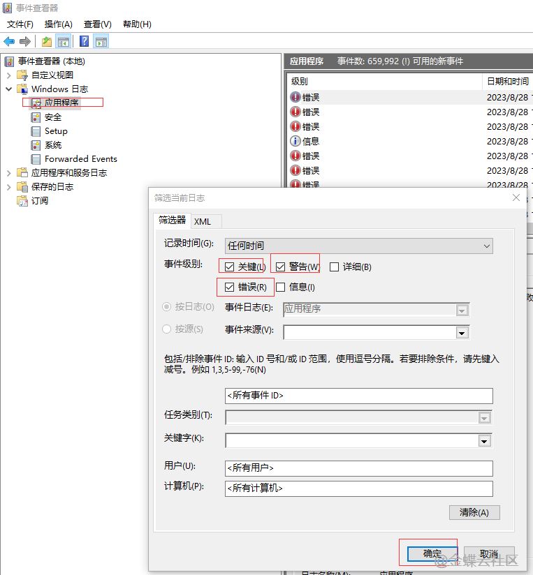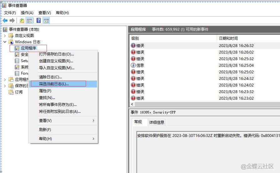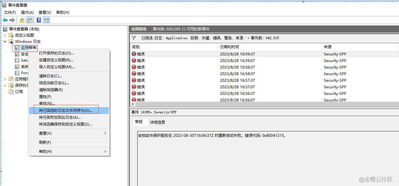 选中“应用程序”--右键--“将已筛选的日志文件另存为”