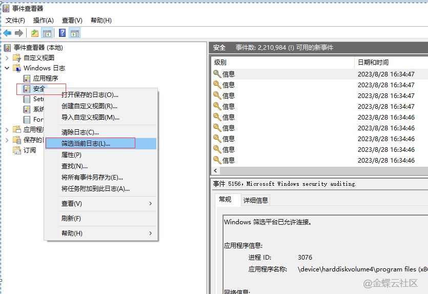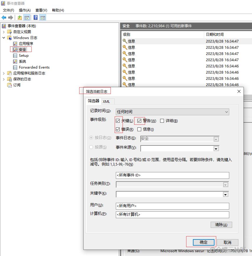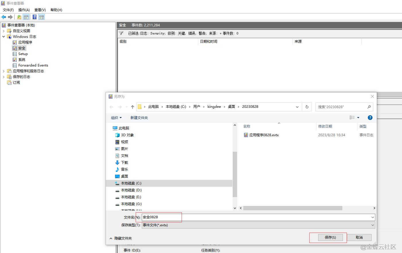 选中“安全”--右键--“将已筛选的日志文件另存为”