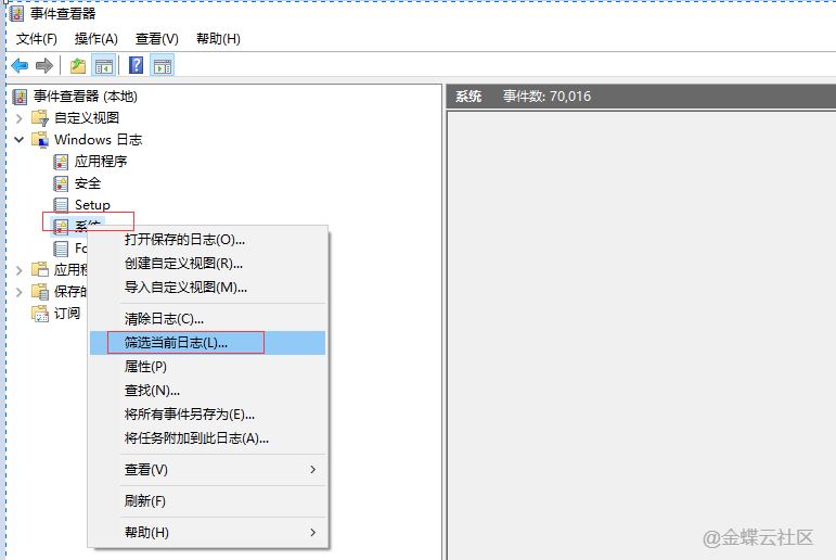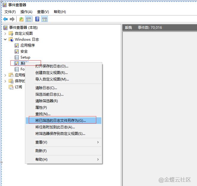 选中“系统”--右键--“将已筛选的日志文件另存为”