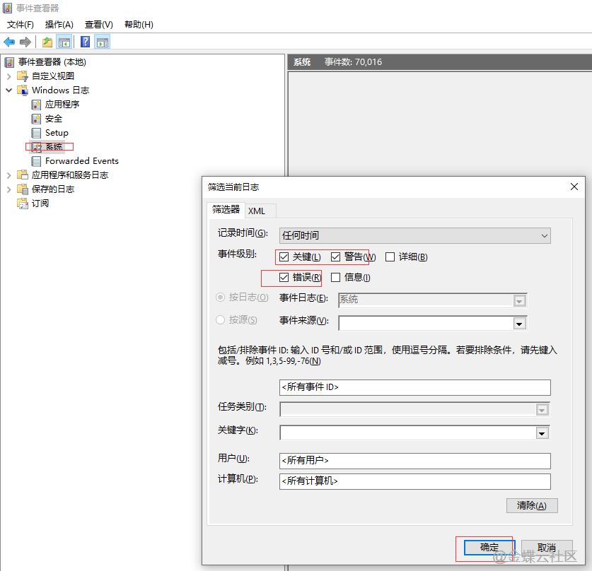 同时勾选“关键”、“警告”、“错误”选项--点“确定”