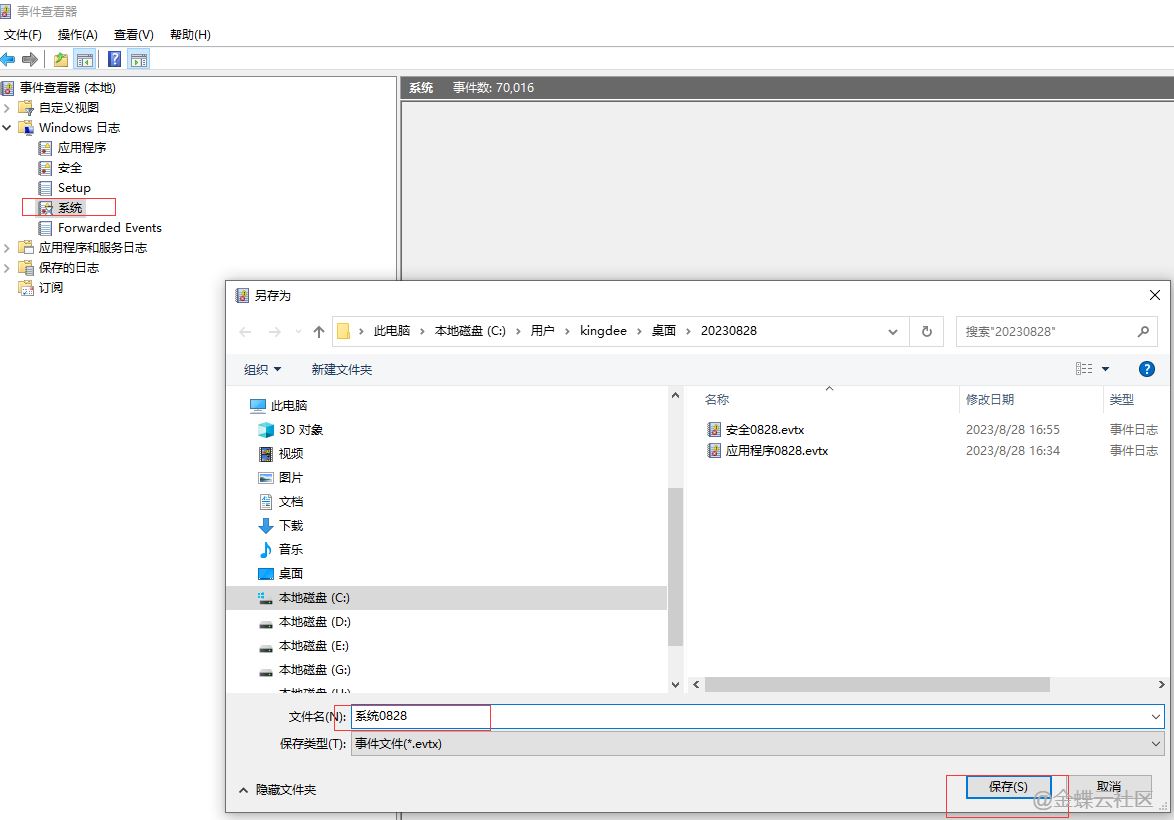在导出向导中,选择保存的位置、文件格式(通常选择默认的日志文件格式 .evtx)、文件名等设置,然后完成导出。