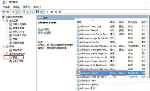 2、进入到”计算机管理“窗口,点击左侧的”服务和应用程序“→”服务“,在右侧的服务名称中找到”windows search“,如下图所示。