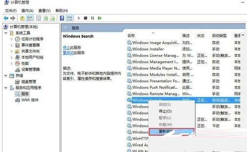 4、回到”计算机管理“窗口,鼠标右击”windows search“,再弹出来的列表中,选择”重新启动(e)“,如下图所示,,过一会儿搜索框服务就重新启动了,就解决了搜索不能用的问题。