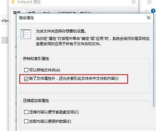 4、进入到“高级属性”窗口,首先取消勾选“除了文件属性外,还允许索引此文件夹中文件的内容(i)”,然后再重新勾选,等待系统重新建立好索引后就可以正常搜索系统设置了,这过程需要一段时间。