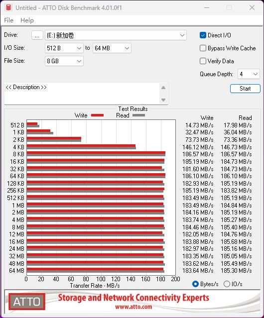 atto disk benchmarks qd4项目,设定文件容量为8gb,在面对4kb以上文件时,西部数据蓝盘4tb读写速度均能达到146 mb/s左右,而在8kb~64mb文件区间中,硬盘读写性能得以充分释放,速度达到了180 mb/s左右。