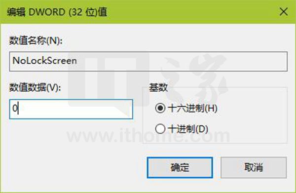 双击dword(32位)值nolockscreen,将数值数据下的输入框中的数字设置为0。
