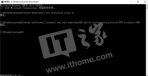 netsh advfirewall firewall add rule name=deny445 dir=in action=block protocol=tcp localport=445