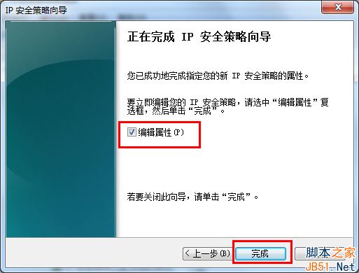 2、在本地组策略编辑器右边空白处 右键单击鼠标,选择“创建ip安全策略”,弹出ip安全策略向导对话框,单击下一步;在出现的对话框中的名称处写“关闭端口”(可随意填写),点击下一步;对话框中的“激活默认响应规则”选项不要勾选,然后单击下一步;勾选“编辑属性”,单击完成。