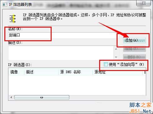 5、出现添加对话框,名称出填“封端口”(可随意填写),去掉“使用 添加向导”前边的勾后,单击右边的“添加”按钮