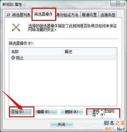 8、在ip筛选器列表中选择刚才添加的“封端口”,然后选择“筛选器操作”选项卡,,去掉“使用 添加向导”前面的勾,单击“添加”按钮