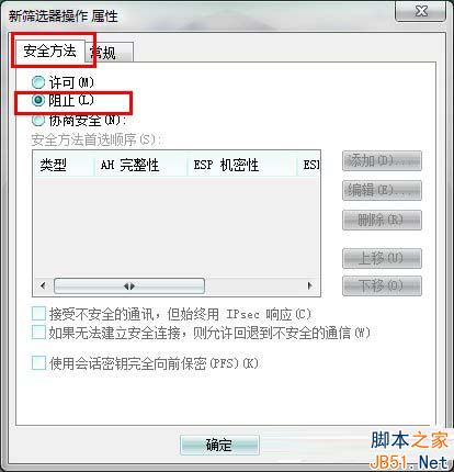 9、在“筛选器操作 属性”中,选择“安全方法”选项卡,选择“阻止”选项;在“常规”选项卡中,对该操作命名,点确定