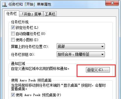2、在弹出的属性界面中点击“通知区域”后面的“自定义”按钮。