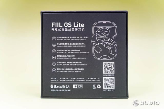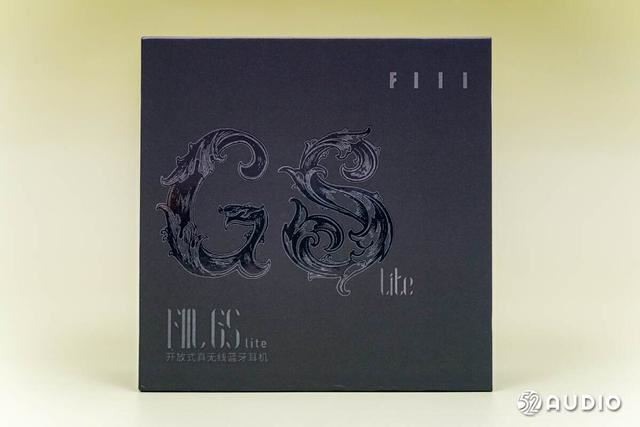 fiil gs lite开放式蓝牙耳机包装的主色调为黑色,正面右上角有fiil的logo。中间部分印刷着巨大且有设计感的“gs”字样,旁边还有lite字样,共同组成耳机名称。左下角则为完整的产品名——fiil gs lite开放式真无线蓝牙耳机。