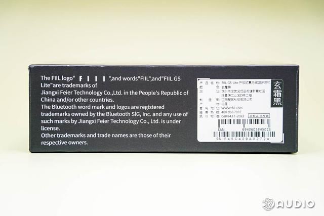 底部贴有产品信息贴纸,产品名称为fiil gs lite开放式真无线蓝牙耳机,颜色为玄霜黑,另外还有制造商、官网地址等信息。
