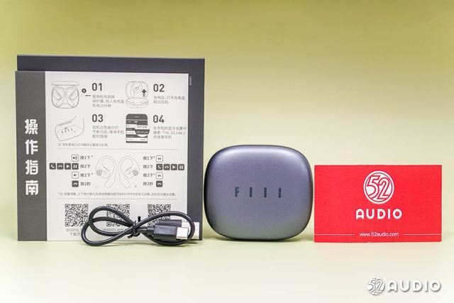 打开包装,所有物品如上。fiil gs lite开放式蓝牙耳机的包装清单包括耳机本体、充电盒、充电线以及操作指南卡片等。