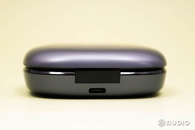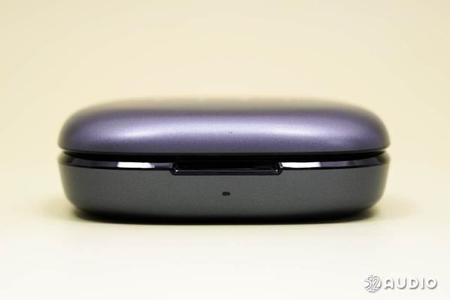 充电盒正面中间位置的凹槽做了加深处理,便于打开充电盒,下方还有一盏充电盒指示灯。