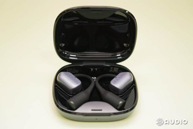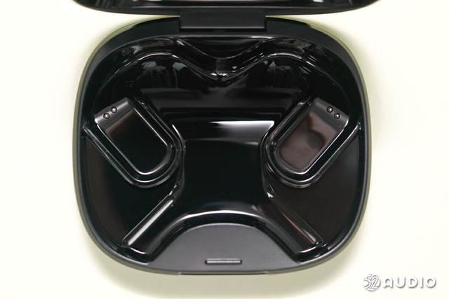 打开充电盒,可以看到水平放置的耳机,没有采用层叠设计。内部为黑色,且较为空旷。