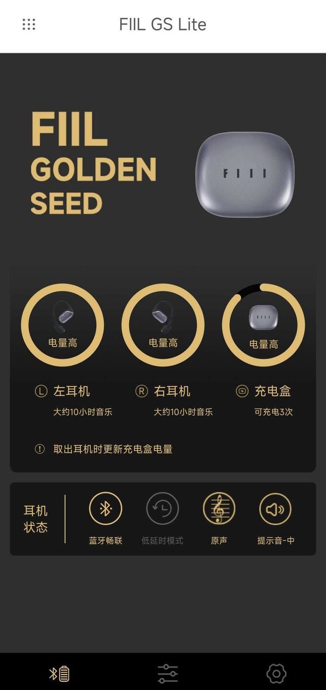 连接成功后,在fiil + app首页可以看到耳机以及充电盒的电量。不过软件没有显示具体电量数值,只显示剩余大约续航时间以及充电盒可充电次数,并用圆环展示大致剩余电量。满电状态下,软件显示耳机大约还能播放10小时音乐。在软件首页可以看到耳机状态信息,包括蓝牙畅联、是否开启低延时模式、音效模式以及提示音量大小,比较直观。