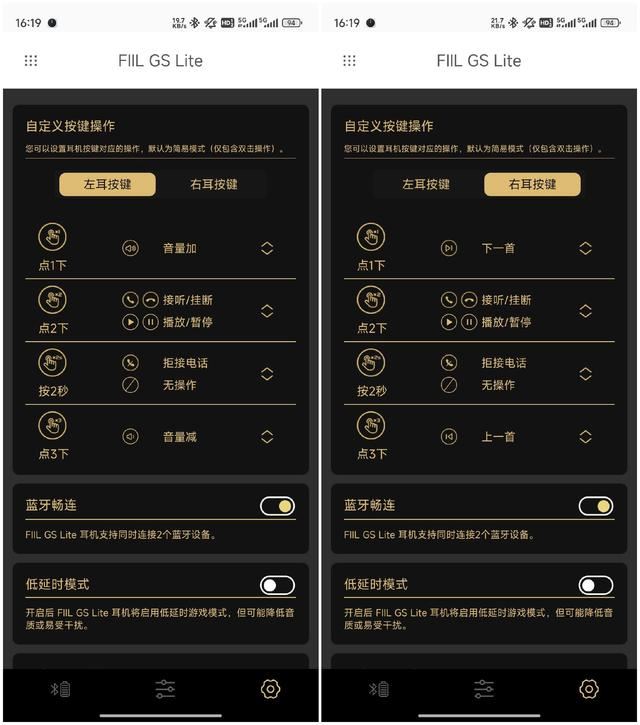 在默认设置下,双击触控区域可以播放/暂停歌曲,也可以接通/挂断电话。长按触控区域2秒拒接电话。通过fiil +软件,你可以设置不同按键功能。比如按一下右耳机切换下一首,按三下切换上一首。按一下左耳机提高音量,按三下降低音量。在操作指南里有推荐的按键功能设置。